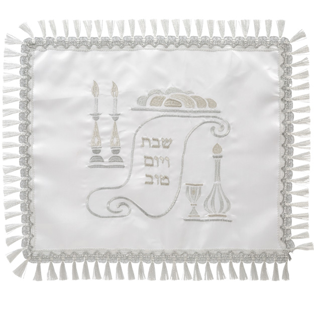 כיסוי חלה לבן מסטן עם ריקמה מהודרת 42×52 ס"מ
