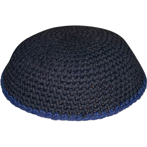 כיפה סרוגה 15 ס"מ שחור מסביב פס כחול