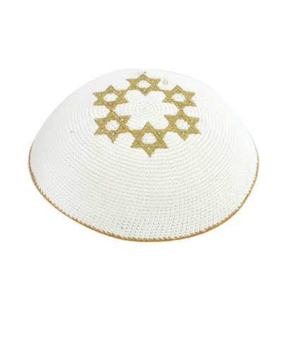 כיפה סרוגה 16 ס"מ לבן 6 מגיני דוד זהב