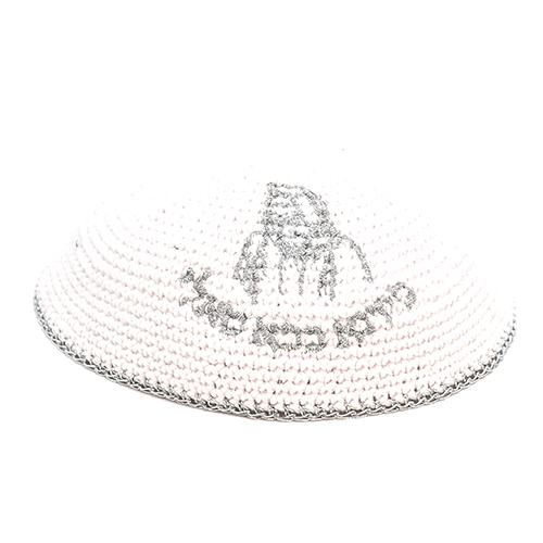 / כיפה סרוגה 16 ס"מ לבנה עם ריקמה "בבא סאלי" כסף