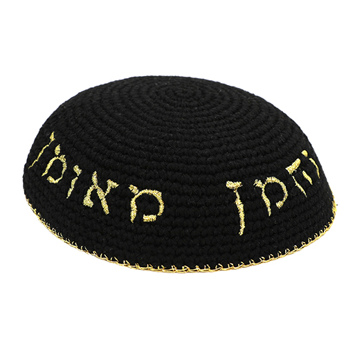 כיפה סרוגה 16 ס"מ שחורה עם ריקמה "נחמן מאומן" זהב