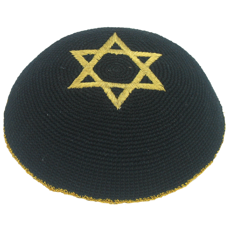 כיפה סרוגה 16 ס"מ שחור עם ריקמה זהב מגן דוד