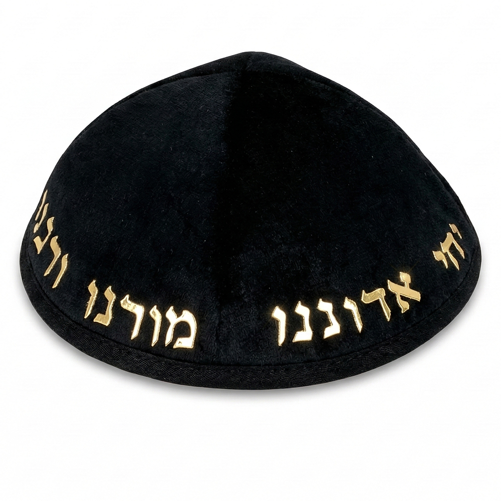 כיפה קטיפה "ארט-מן" עם אותיות בולטות זהב "יחי אדוננו.."גודל 4 – שחור