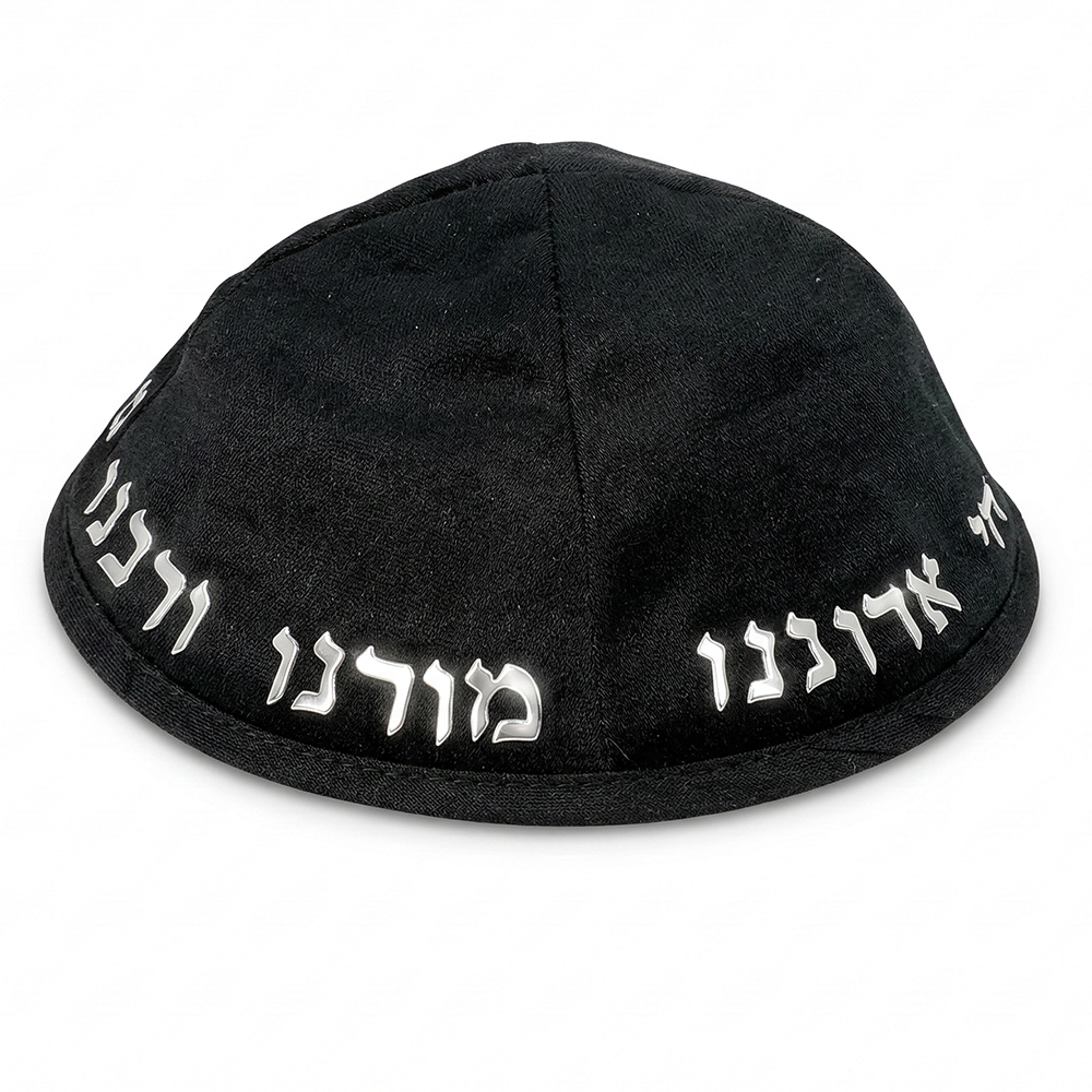 כיפה קטיפה "ארט-מן" עם אותיות בולטות כסף "יחי אדוננו.."גודל 4 – שחור