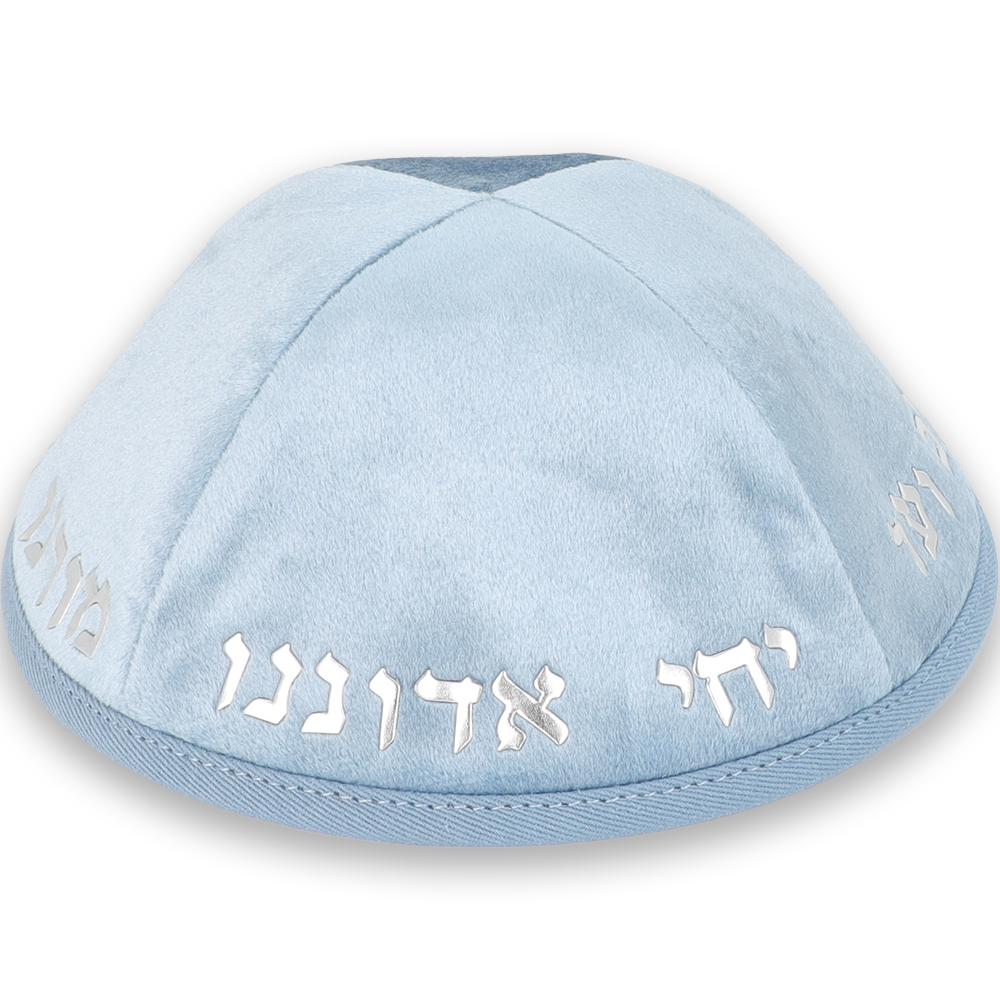 כיפה קטיפה "ארט-מן" עם אותיות בולטות כסף "יחי אדוננו.."גודל 4 – תכלת