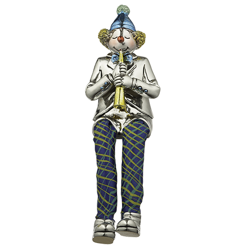 ליצן יושב מפוליריזן מוכסף עם רגלי בד מנגן בקלרינט