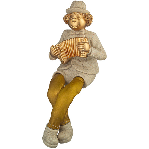 / ליצן יושב מפוליריזן עם רגלי בד כסף מנגן באקורדיון