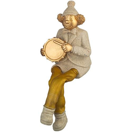 / ליצן יושב מפוליריזן עם רגלי בד כסף מנגן בתוף