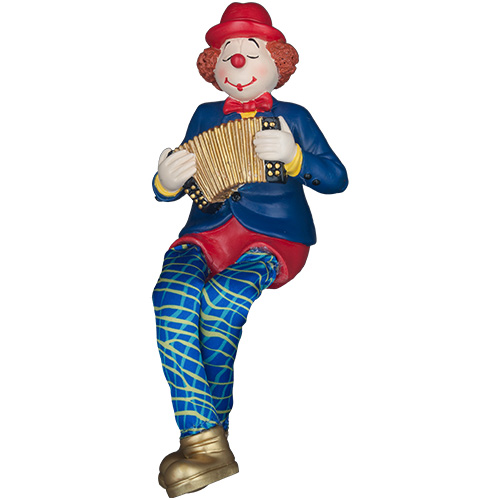 ליצן יושב מפוליריזן צבעוני עם רגלי בד כסף מנגן באקורדיון
