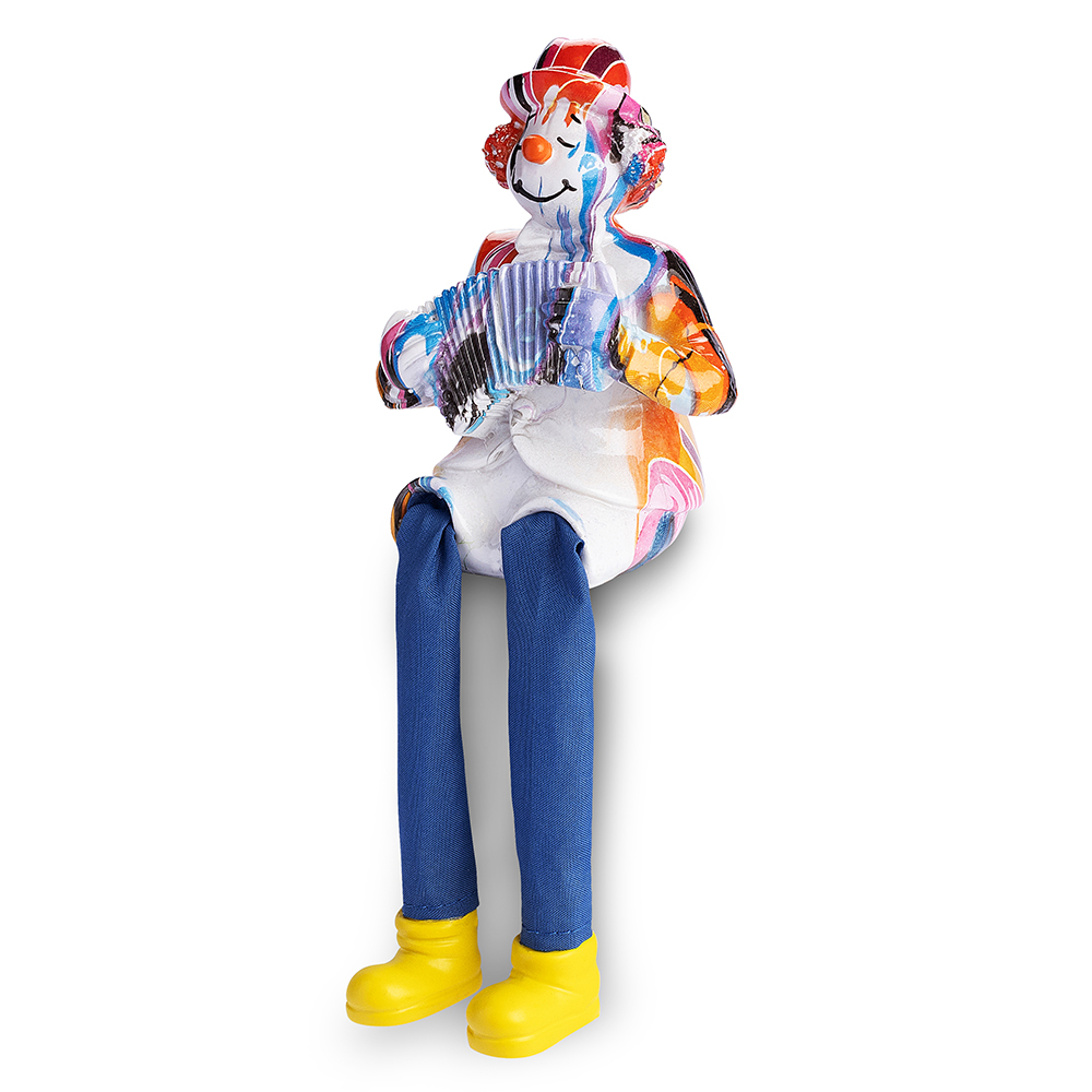 ליצן יושב מפוליריזן צבעוני עם רגלי בד מנגן באקורדיון