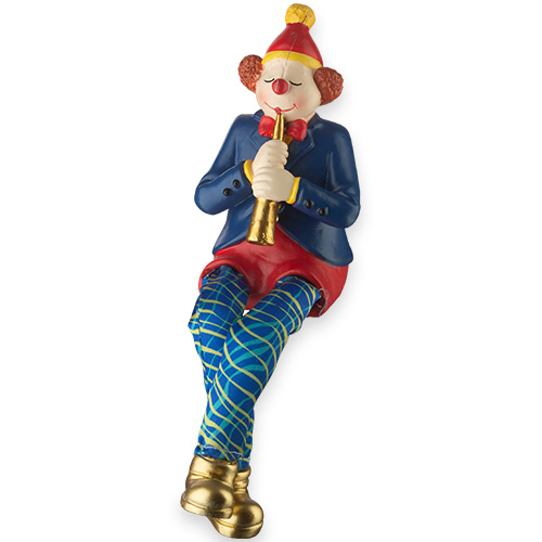 ליצן יושב מפוליריזן צבעוני עם רגלי בד מנגן בקלרינט
