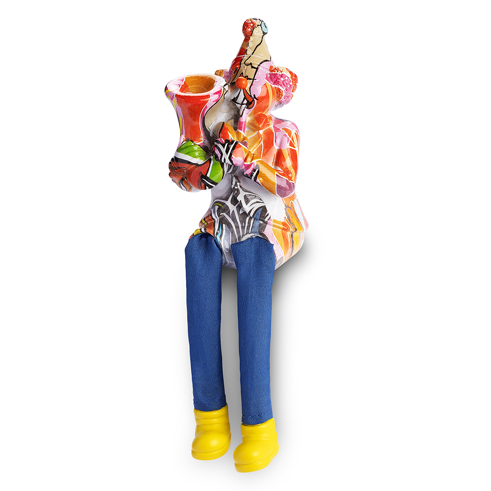 / ליצן יושב מפוליריזן צבעוני עם רגלי בד מנגן בטרומבון