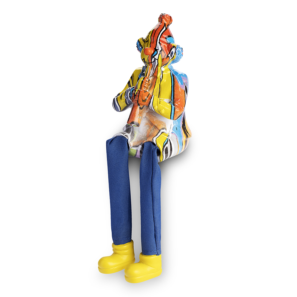 ליצן יושב מפוליריזן צבעוני עם רגלי בד מנגן בקלרינט