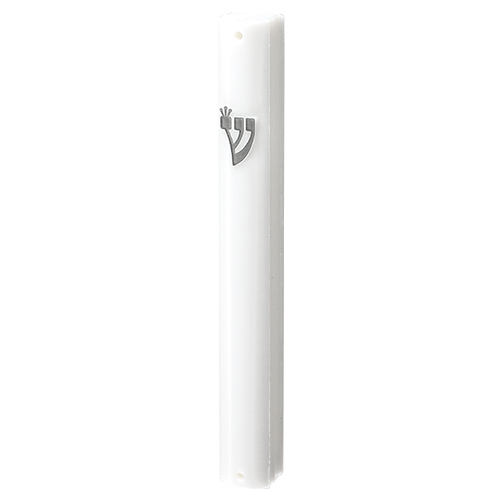 מזוזה פלסטיק לבנה 15 ס"מ "ש" כסף עם פקק גומי