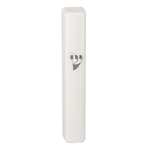 מזוזה פלסטיק 12 ס"מ לבנה "ש" כסף פקק גומי – ללא