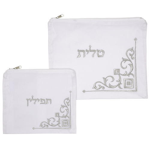 סט טלית תפילין קטיפה לבנה עם ריקמה 36X29 ס"מ