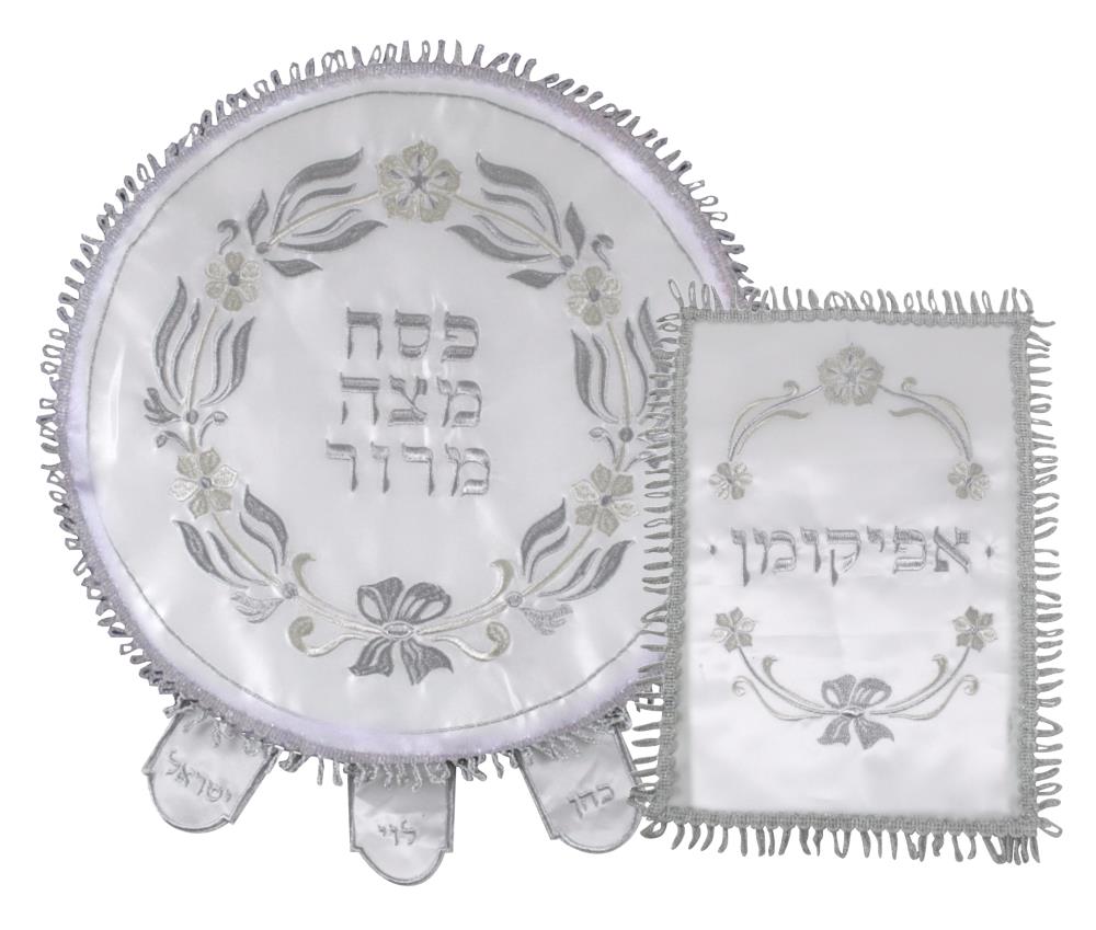 / סט פסח ואפיקומן רקמת כסף זר פרחים מסביב אריזת צלופן