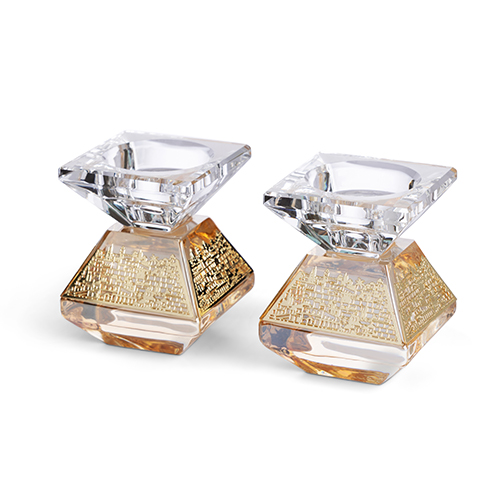 / פמוטי קריסטל זהב שקוף עם פלקטה ירושלים 6.5סמ