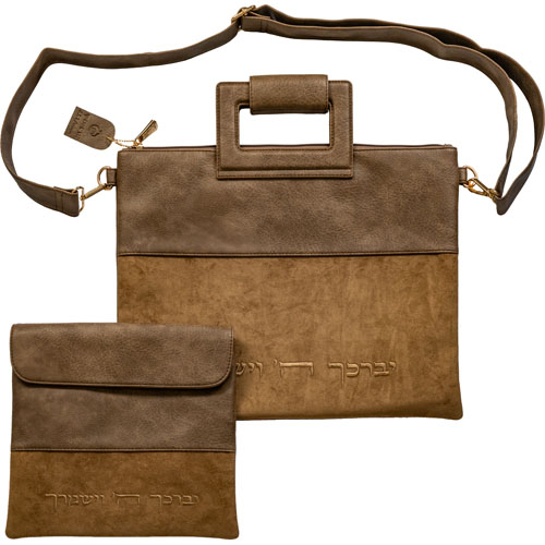 תיק טלית תפילין מהודר דמוי עור חום בהיר רקמה יברכך 38X31 ס"מ
